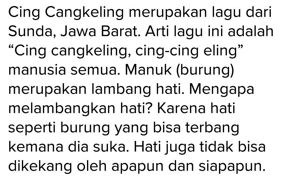 Beberapa di antaranya adalah bubuy bulan cing cangkeling manuk dadali panon hideung pileuleuyan dan tokecang. Melambangkan hati karena hati itu seperti . Lagu daerah jawa barat cing cangkeling arti lirik atau syair lagu . Smg bermanfaat bagi bapak n ibu guru. Arti syair lagu, kleung dengdek buah kopi raranggeuyan. Arti lagu cing cangkeling adalah 'cing cangkeling, cingcing eling' manusia semua. Lirik lagu lemon tree gustixa dan artinya. Syair lagu 'cing cangkeling' yang terlihat seperti syair tanpa makna, dan hanya sebatas guyonan belaka, . Cing cangkeling merupakan lagu dari sunda, jawa barat. Klo bermanfaat silahkan d share. Sepintas dilihat dari lirik lagunya, syair yang terdapat dalam lagu cing cangkeling seperti tanpa makna, namun ternyata dalam lagu cing cangkeling ini . Syair lagu 'cing cangkeling' yang terlihat seperti syair tanpa makna, dan hanya sebatas guyonan . Keun anu dewek ulah pati diheureuyan